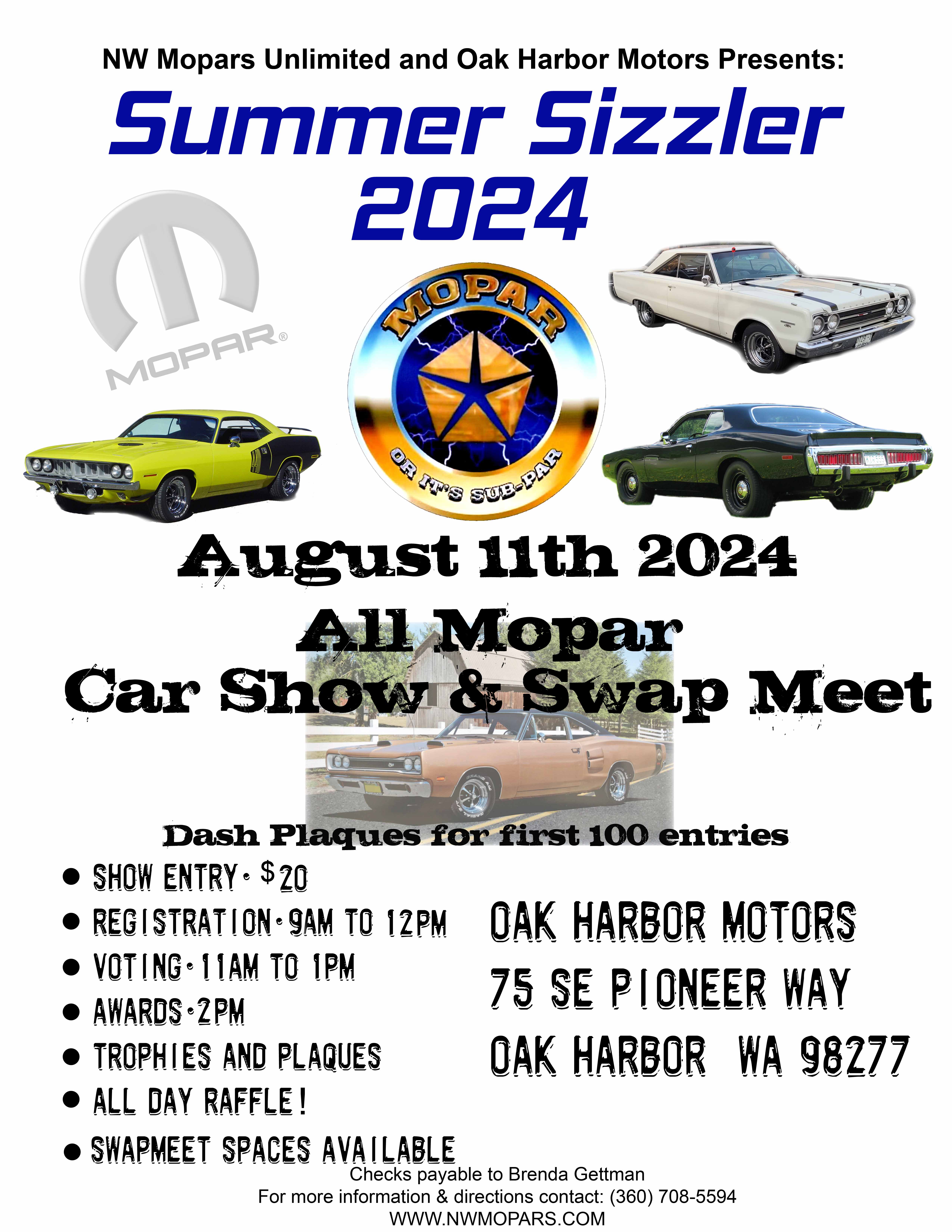 Download Car Show Application Download Mail application to: NW MOPARS 13558 Bayview Rd Mt Vernon, Wa 98273 Download Flyer Download Flyer-2025 small Sunday, August 10, 2025 @9:00am Oak Harbor Motors-75 SE Pioneer Way, Oak Harbor, Washington 98277 Share This: Join our Facebook Group